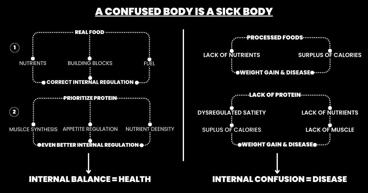 The main problem with the standard dietary intake today is the lack of nutrients along with a surplus of calories. Increasing protein fixes both of these issues. It creates a more nutrient-dense diet and leads to fewer total calories consumed.